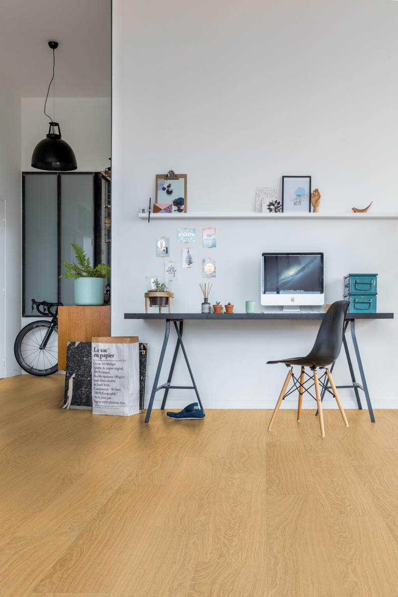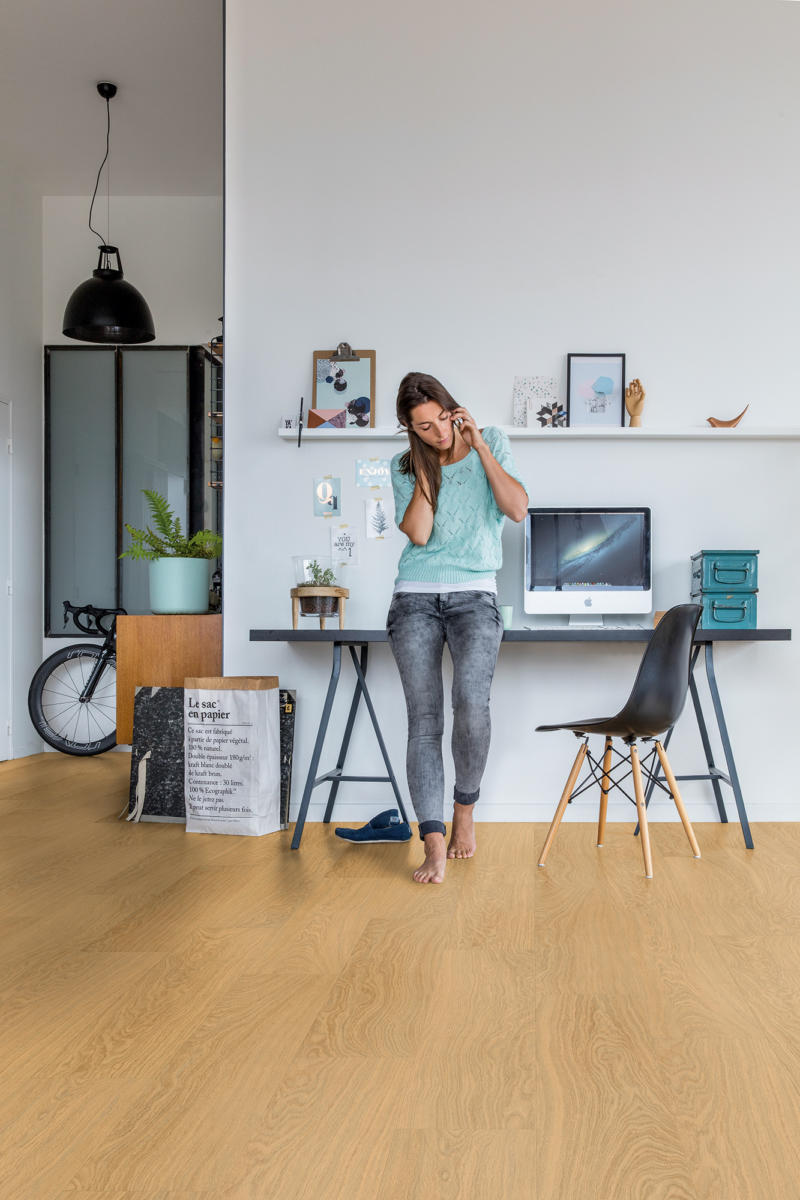 Create a warm and inviting home environment with the Pure Oak Honey flooring, which is part of the Quick-Step Pulse Hybrid collection. While visually this hybrid flooring features a detail-rich hardwood appearance, it has an ultra-strong core top layer that renders it resistant to impact and scratches that real hardwood is often vulnerable to.