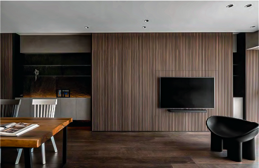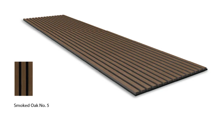 Each StarEFX Slat Panel is designed with dimensions of 2700mm x 600mm and features lamellas that are 12mm deep and 26mm wide, spaced 14mm apart. These slats are affixed to a 9mm thick acoustic polyester felt base. To accommodate the fiber optics and module, the panel is framed by 14mm wide polyester strips on the rear side for an overall panel thickness of 30mm.